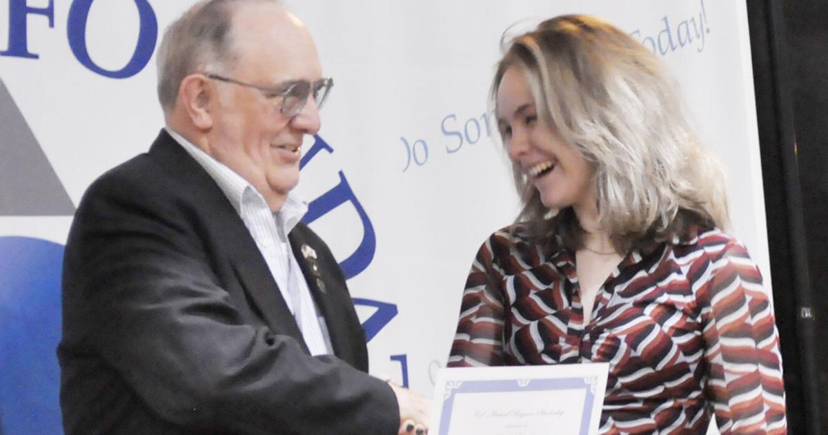 Luella Sikarski, right, shakes hands Monday night with Dick Ardisson at a Celebrating Achievement event at Grace Heartland Church in Elizabethtown as Ardisson presents Sikarski with the Col. Michael Baymor Scholarship.
