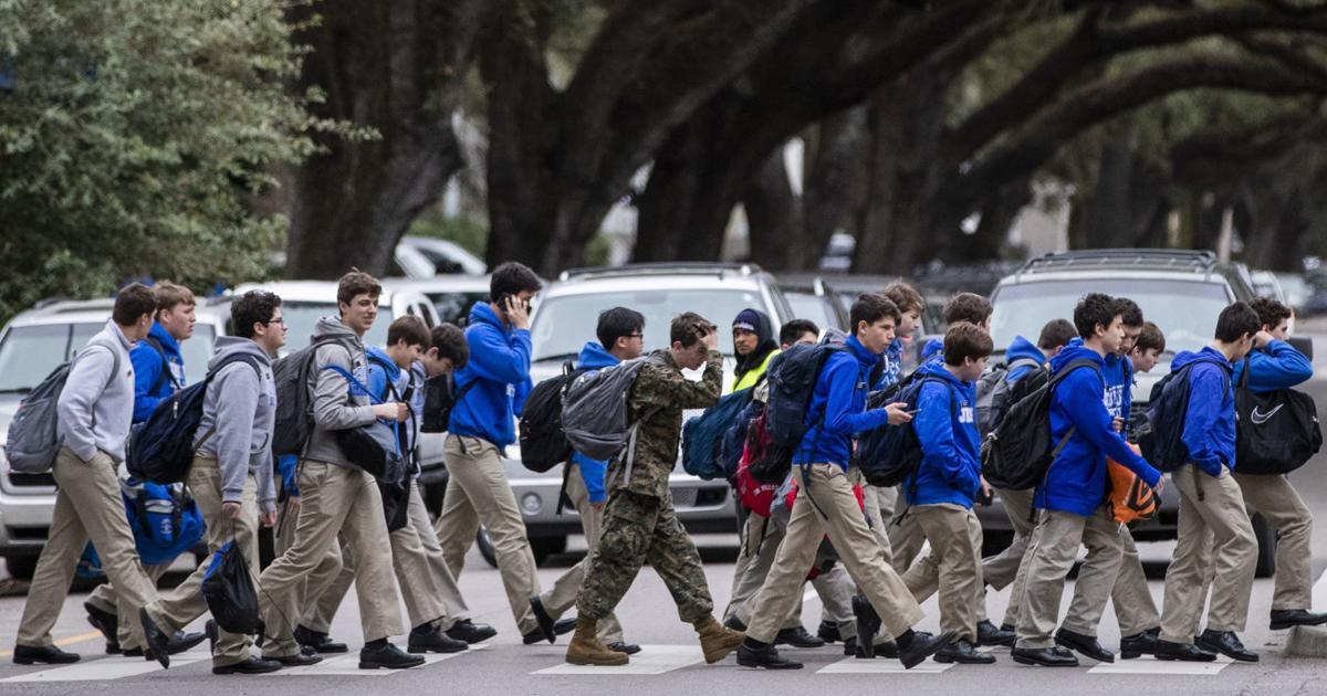Jesuit High School students cross Banks street after dismissal in New Orleans, La., Friday, Feb. 8, 2019.