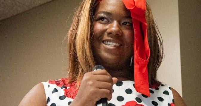 Scholarship recipient Renee Harvey smiles after delivering a speech at the SECU scholarship ceremony at Randolph Community College in Asheboro on Sept. 25.