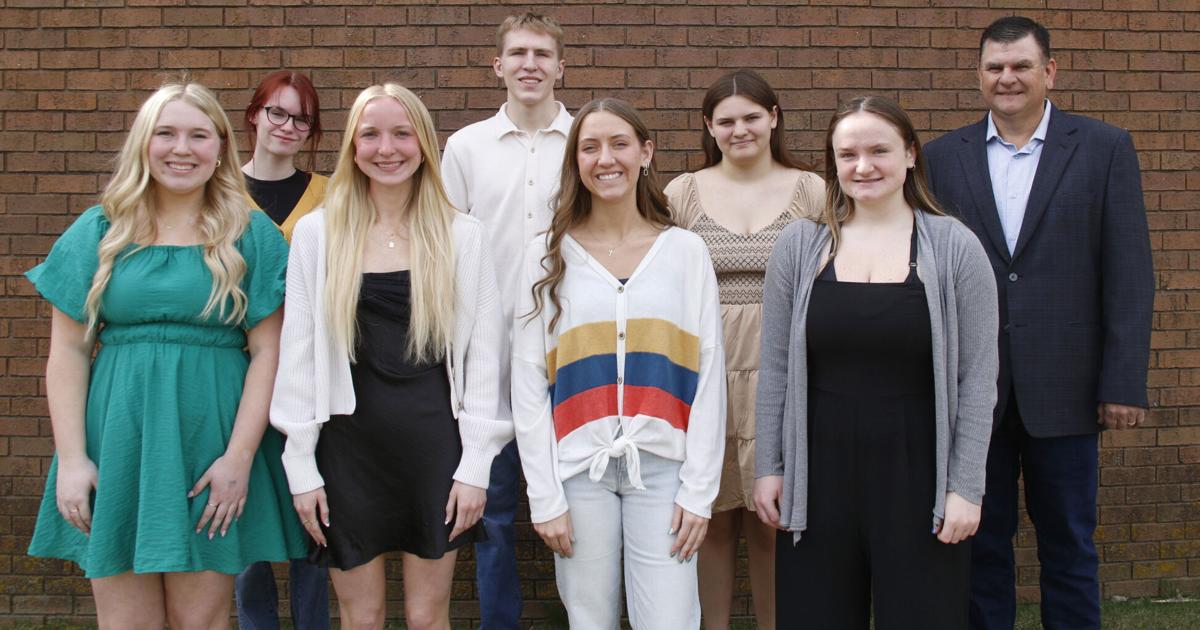 Halbur University Scholarship winners recognized following Mass Sunday, April 13, at St. Augustine Catholic Church are (front, from left) Kiyah Wittrock, Marasyn Wittrock, Alanah Hausman and Emma Branning; (back, from left) Raegan Ellis, Sam Rotert and Hannah Grossman. Tim Hinners (back, right) is president of the Halbur U. Board of Deans.