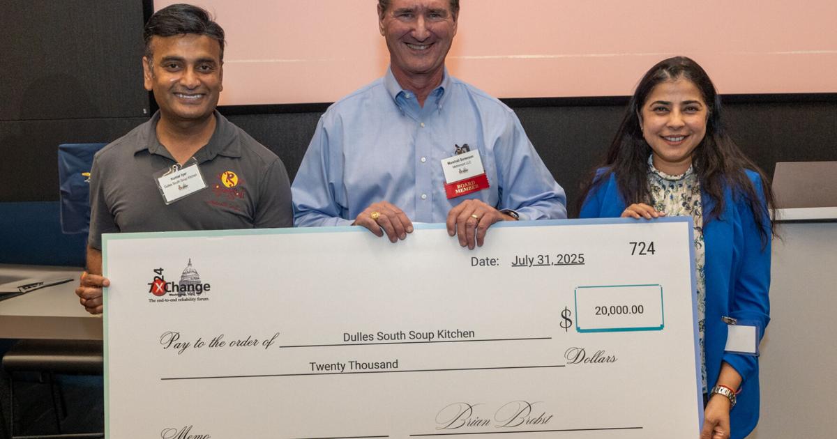From left, Dulles South Soup Kitchen’s Kumar Iyer, 7×24 Exchange DC Chapter Board Member Marshall Sorenson, Dulles South Soup Kitchen Found Devina Mahapatra as the 7×24 Exchange DC Chapter presents a check to the nonprofit.
