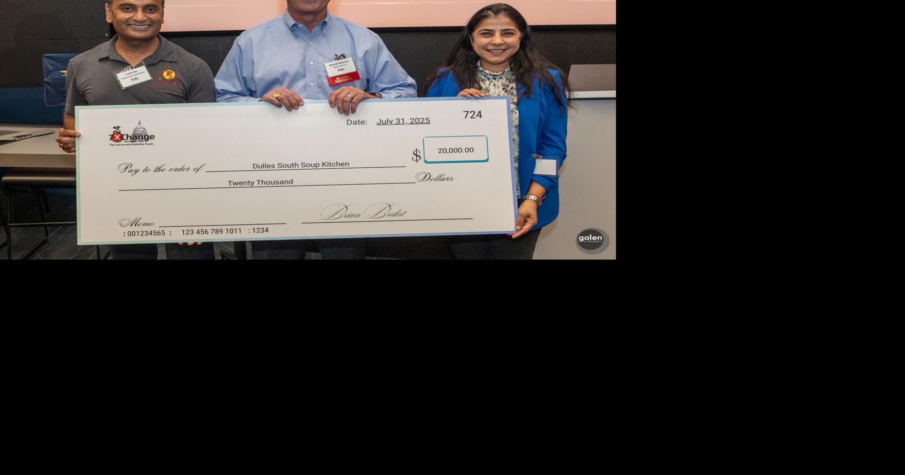 From left, Dulles South Soup Kitchen’s Kumar Iyer, 7×24 Exchange DC Chapter Board Member Marshall Sorenson, Dulles South Soup Kitchen Found Devina Mahapatra as the 7×24 Exchange DC Chapter presents a check to the nonprofit.