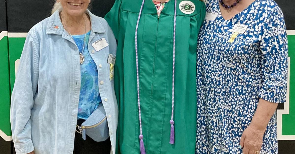 Aley Williams, holding her recent scholarship award from P.E.O., is shown with Chapter CU members Eleanor Tucker, left, and Diane Middleton, right.