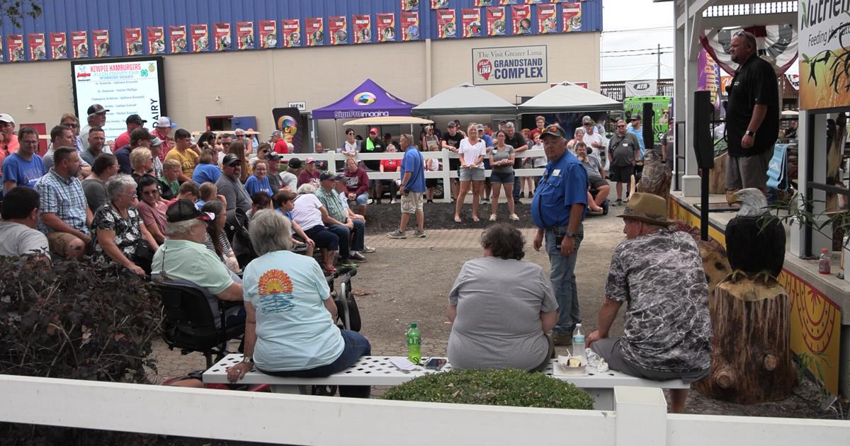 The Nutrien Plaza Stage was packed with auction items, including wood sculptures carved this week by the Bear Hollow Wood Carvers, bottles of wine that competed at the fair, and hanging baskets that decorated the midway.