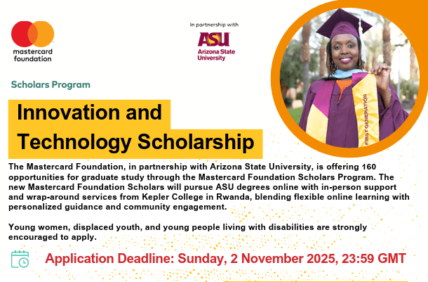 The Mastercard Foundation, in partnership with Arizona State University (ASU), will provide graduate scholarships to train 160 young African professionals at the master’s level for various programs over 5 years (2025 – 2030). This scholarship program offers a unique opportunity for students to pursue an ASU Online degree while benefiting from in-person support and comprehensive wrap-around services provided through Kepler College in Rwanda. This innovative approach combines the flexibility of an online education with the personalized guidance, resources, and community engagement available at Kepler College to ensure a well-rounded and supportive learning experience.