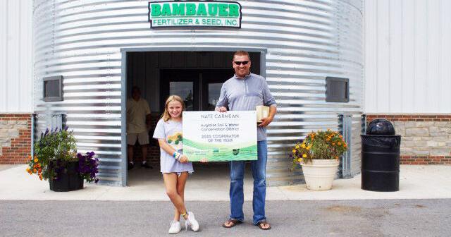 Nate Carmean, the 2025 Conservation Award recipient, and his daughter pose with his award at the Auglaize Soil and Water Conservation District appreciation luncheon