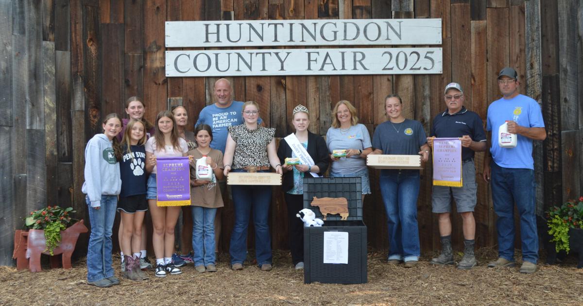 Huntingdon County Dairy Princess Macy Myers, center, helped present the grand champion and reserve champion milk, as well as a wagon of dairy items to the highest bidders during the Junior Livestock Sale at the Huntingdon County Fair Friday. Andy Harpster of Evergreen Farms purchased the grand champion milk with 18 pounds of butter and a handmade engraved serving tray full of whoopie pies for $1,550, Mike and Nate Mowrer of Mowrer Farms purchased the reserve champion milk with a with 18 pounds of butter and a handmade engraved serving tray full of whoopie pies for $1,220. The trunk, sponsored by the Pat and Cindy Lemin family of Mountain Supply and Repair Inc., contained dairy items and was purchased by Martin Oil Co. for $1,600. Funds raised through the auction of the items go to support the Huntingdon County Dairy Scholarship Program. This year’s recipients are Taylor Heeter, Madison Mowrer and Amelia Russell. Taking part in the presentation were, from the left, Norah Harpster, Avery Lake, Gabriella Harpster (behind) Teagan Harpster, Cindy Lemin, Juliette Harpster, Andy Harpster, supreme cow exhibitor Taylor Heeter, Myers, Karen Padula of Martin Oil, reserve supreme cow exhibitor Adria Russell, Mike Mowrer and Nate Mowrer.
