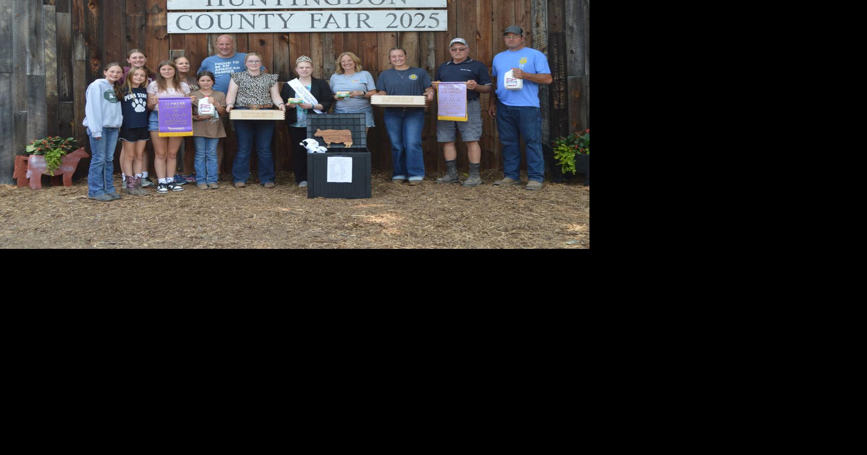 Huntingdon County Dairy Princess Macy Myers, center, helped present the grand champion and reserve champion milk, as well as a wagon of dairy items to the highest bidders during the Junior Livestock Sale at the Huntingdon County Fair Friday. Andy Harpster of Evergreen Farms purchased the grand champion milk with 18 pounds of butter and a handmade engraved serving tray full of whoopie pies for $1,550, Mike and Nate Mowrer of Mowrer Farms purchased the reserve champion milk with a with 18 pounds of butter and a handmade engraved serving tray full of whoopie pies for $1,220. The trunk, sponsored by the Pat and Cindy Lemin family of Mountain Supply and Repair Inc., contained dairy items and was purchased by Martin Oil Co. for $1,600. Funds raised through the auction of the items go to support the Huntingdon County Dairy Scholarship Program. This year’s recipients are Taylor Heeter, Madison Mowrer and Amelia Russell. Taking part in the presentation were, from the left, Norah Harpster, Avery Lake, Gabriella Harpster (behind) Teagan Harpster, Cindy Lemin, Juliette Harpster, Andy Harpster, supreme cow exhibitor Taylor Heeter, Myers, Karen Padula of Martin Oil, reserve supreme cow exhibitor Adria Russell, Mike Mowrer and Nate Mowrer.