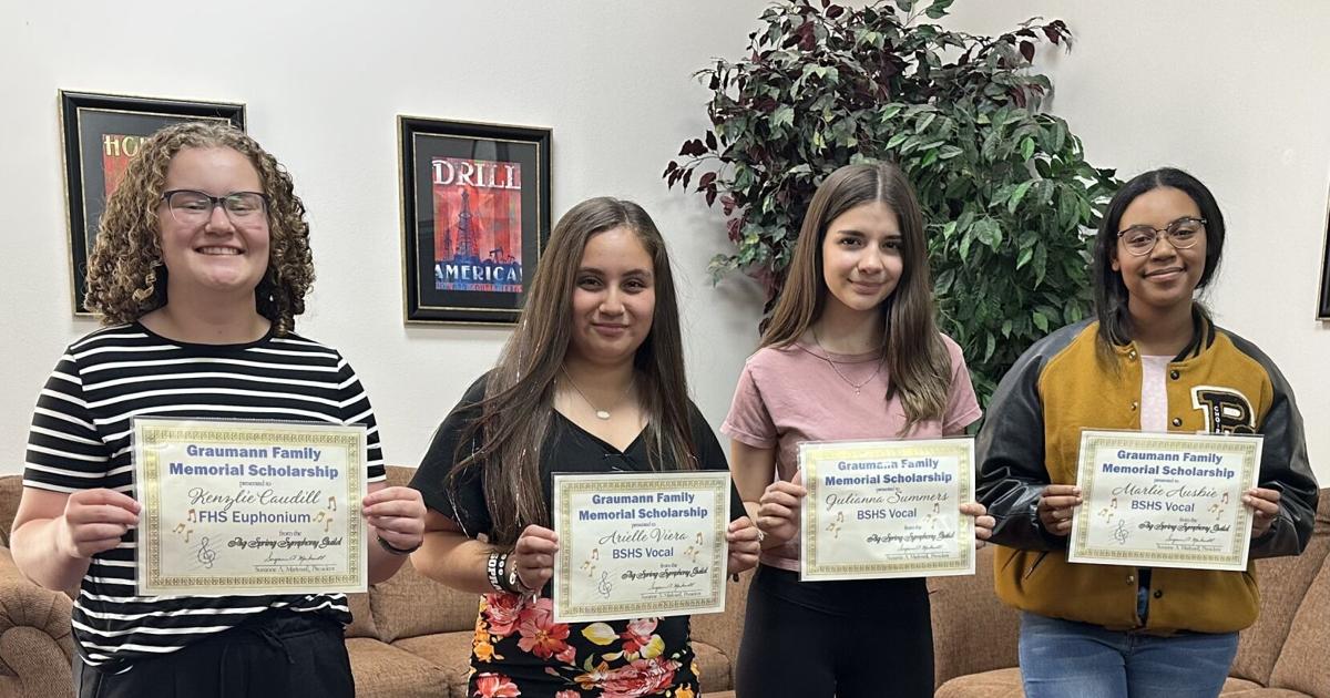 The Big Spring Symphony Guild is proud to present their 2025 Graumann Family Memorial Scholarship Recipients. Kenzli Caudill (Junior) from Forsan High School got an instrumental scholarship on euphonium. There were 3 vocal scholarships awarded to students at Big Spring High School: Arielle Viera (Junior), Juliana Summers (Graduating Senior) and Marlie Ausbie (Junior). We wish to congratulate these exceptional students who not only excel in music, but many other areas, including academics and sports.
