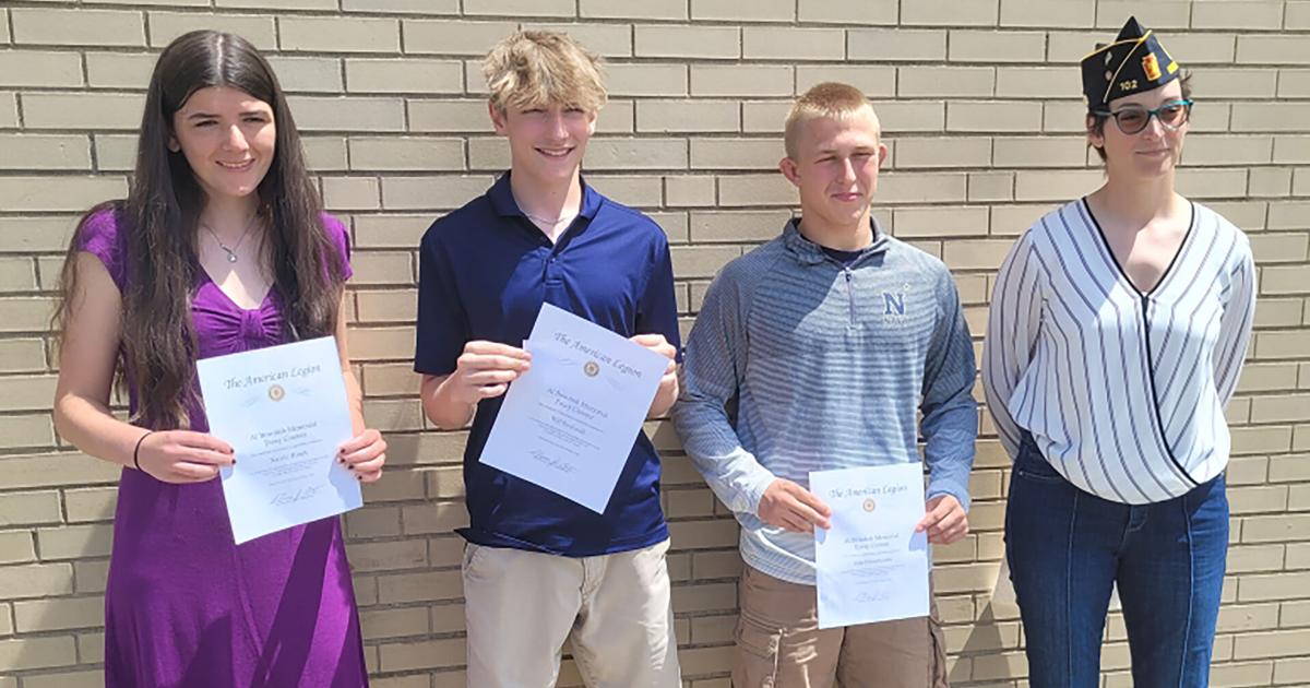 Winners of this year’s American Legion essay contest were presented their awards by veteran Jessica McWain. This year’s winners were (from left) Natalie Himes, Will Shofestall and Cole Householder.