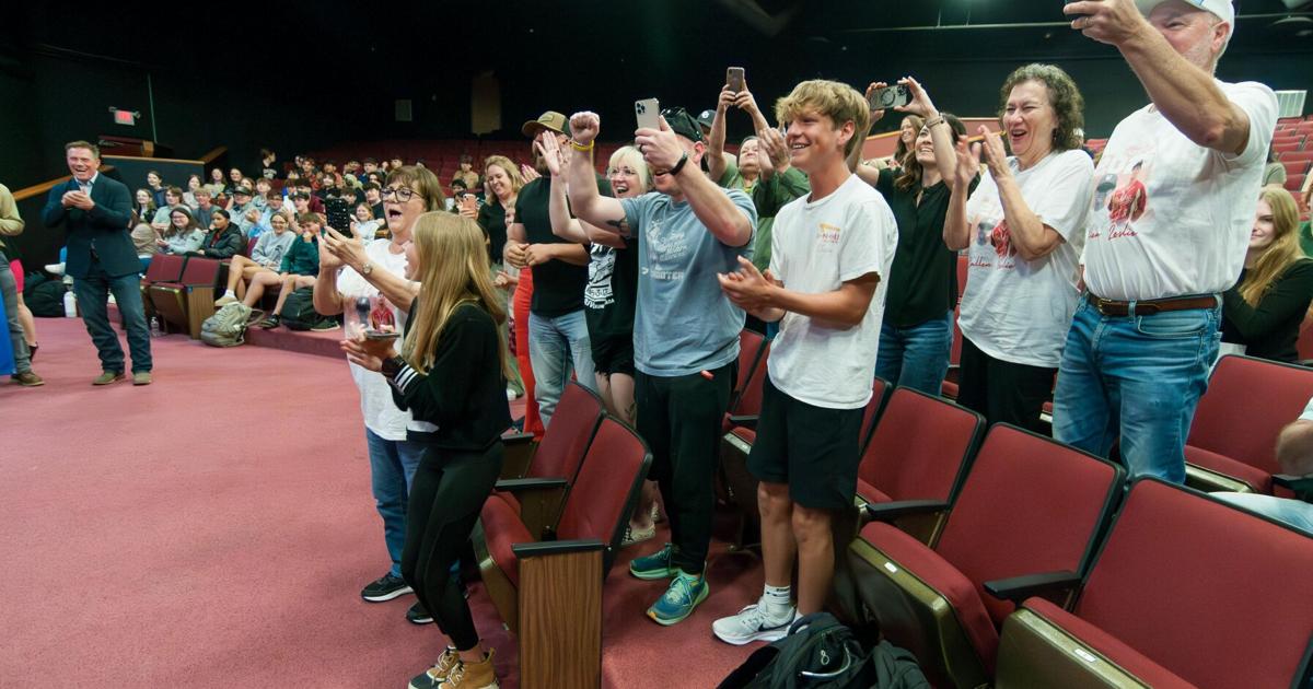 Friends, family members, and classmates of Byng High School senior Callen Leslie stand and cheer for Leslie during a ceremony Tuesday in the school’s auditorium.