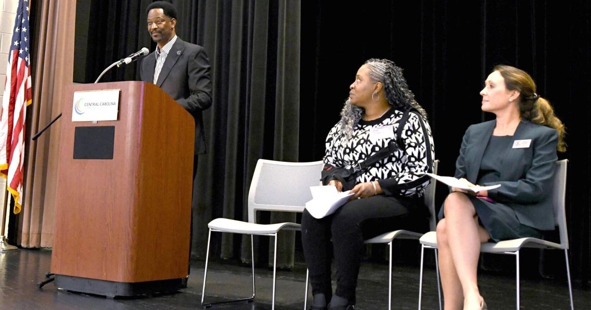 On left, Bishop Charles Mellette, senior pastor of the Christian Provision Ministries, served as master of ceremonies for the Central Carolina Community College Foundation’s Scholarship Luncheon. Also pictured are Ebony Cole, student scholarship recipient, and Meghan Brown, vice president of advancement, operations and government relations.