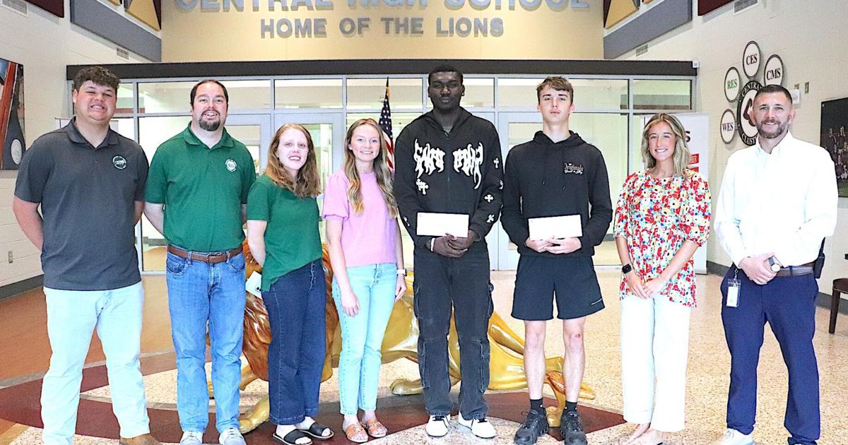 Central High School seniors were awarded $1,000 scholarships from the Carroll EMC Foundation. Cameron Johnson, Courtney Carroll and William Blanchard were recipients of the annual foundation awards. Pictured from left are Carroll EMC representative Mason Jackson, Ryan Sammon, Taylor Key, Carroll, Johnson, Blanchard, Carroll EMC representative Rory Delandero and Central High School Assistant Principal Zac Cooper.