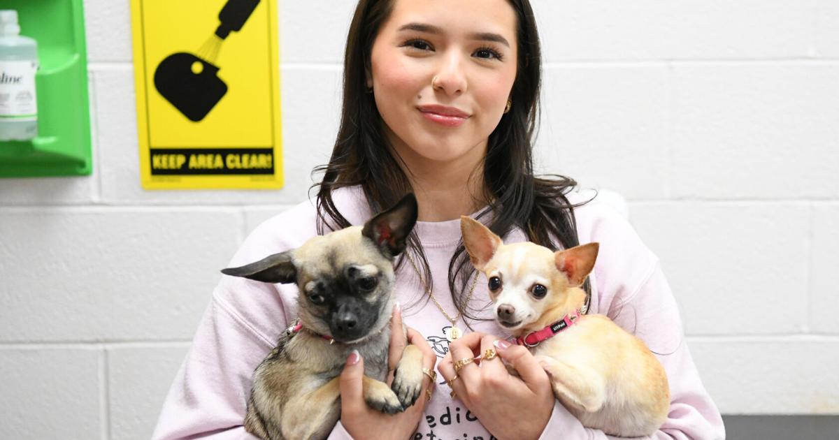 Eve Lopez, Columbia State veterinary technology student, and AVMF/Dechra scholarship recipient, and her two dogs (left to right), Pepperoni and Gertrude.