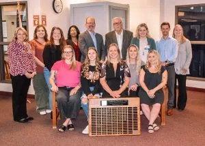 )Front Row: Taylor Postin, Curtlyn Coale, Casey Atteberry, Brittney Wiggins, and Brittany Johnson. Back Row: Nursing Instructors Tracy Hicks, Brittany Rose, and Brianna Trowbridge; FCC President Dr. Sharmila Kakac; FMH CEO Andy Flemer; Jerry Cox; FMH CNO Hollie Barrett, MSN, RN, CRHCP; FCC Foundation President Luke Harl; Allied Health Program Advisor Julie Bullard)