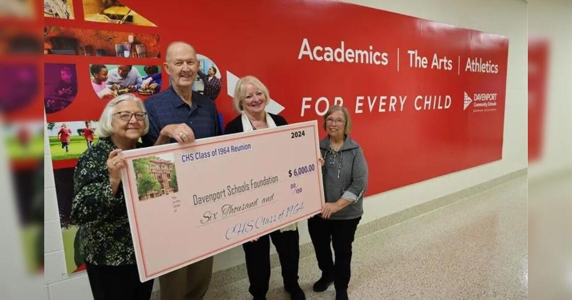 From left, Davenport Central High School Class of 1964 graduates Judy Koehler and Tom Ketelsen; Sally Crino, executive director of the Davenport Schools Foundation, and Nancy Czubara, another ’64 graduate, pose after the class donated $6,000 toward Central’s Future Teachers Scholarship, fall 2024.Â