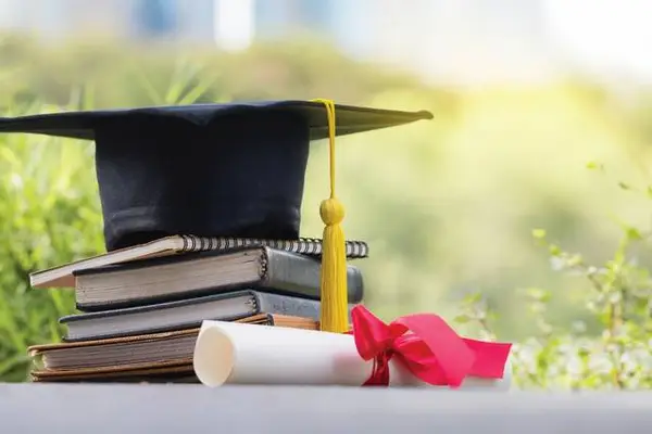 Graduation cap with tassle atop a stack of books in an outdoor setting; graduate; high school; student excellence