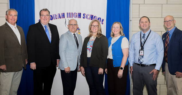 Pictured from left to right are Decorah High School counselor Pat Trewin, Decorah Community School District Superintendent Tim Cronin, Luther College President Brad Chamberlain, Decorah Community School District Board of Education President Cindy Goodner, Decorah High School counselor Brigit Storhoff, Decorah High School Principal Brad Hurst and Matthew R. Beatty, vice president for enrollment management at Luther. Photo courtesy Luther College.