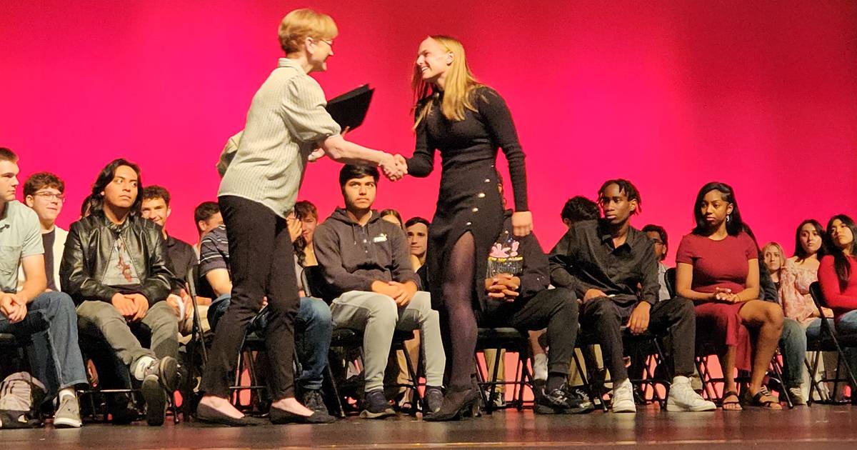Kishwaukee Symphony Orchestra principal violinist and board member Lynn Slater presenting the KSO High School Senior Musician Scholarship to Jenna Zimmerman (Photo provided by the Kishwaukee Symphony Orchestra )