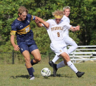 - Times Observer Photos by Steve Younger Eisenhower’s Bryceton Wilkins battles for possession with a Titusville player during Wednesday’s game at Mike Decker Field.
