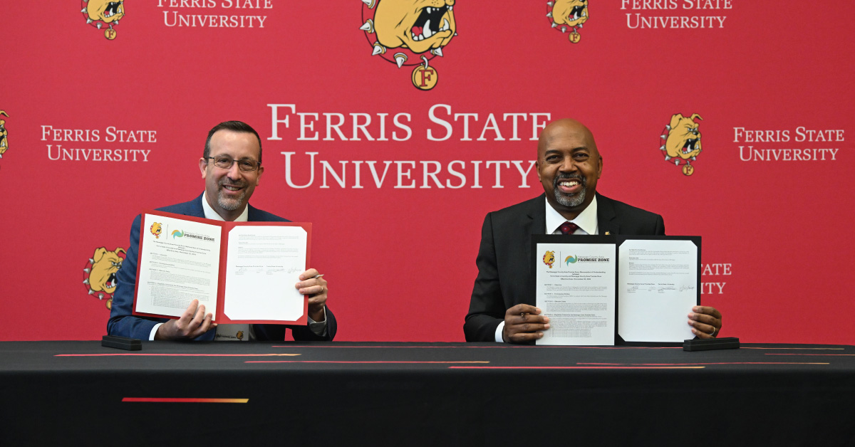 Ferris State President Bill Pink and Newaygo County Area Promize Zone Chairperson                   Blake Prewitt signed an agreement on Friday to put the plan into effect immediately,                   making the Newaygo Promise Scholarship available for students attending Ferris State                   in fall 2025, seeking either an associate or bachelor’s degrees.