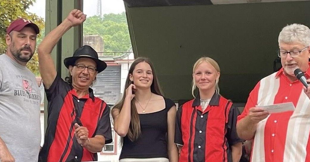 Franklin Blues and BBQ festival organizers Albert Abramovich and Max Schang, far-left and next-over, and Jeff Hufnagel, right, stand with Franklin Area High School students and Blues and BBQ scholarship awardees Gabi Laderer, center, and Madi Stewart at the festival in June.