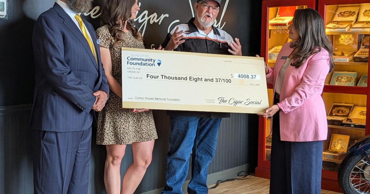 Don Kincaid gives a check to to the Quad Cities Community Foundation at The Cigar Social to support a scholarship fund set up in memory of his son, Connor Kincaid.