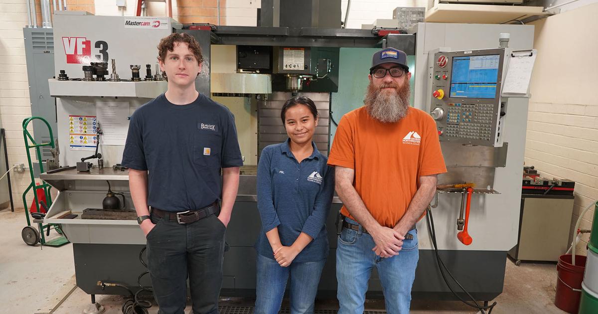 Gene Haas Scholarship recipients Jesse Nicholson (from left) and Mayahuel Yaoapoqa pose with Bart Jenkins, program director and instructor of Precision Machining and Manufacturing at GNTC, in the Floyd County campus lab.