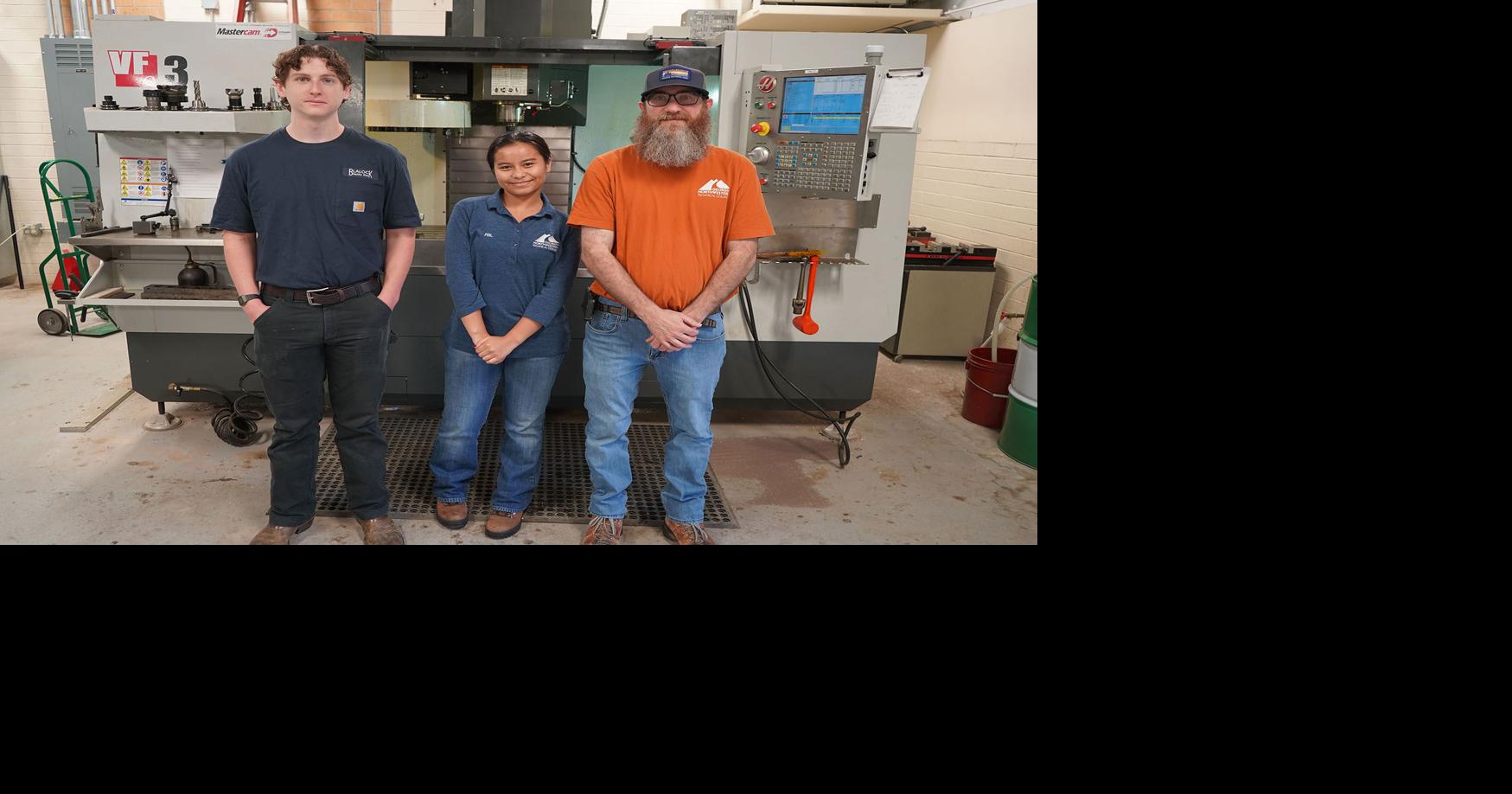 Gene Haas Scholarship recipients Jesse Nicholson (from left) and Mayahuel Yaoapoqa pose with Bart Jenkins, program director and instructor of Precision Machining and Manufacturing at GNTC, in the Floyd County campus lab.