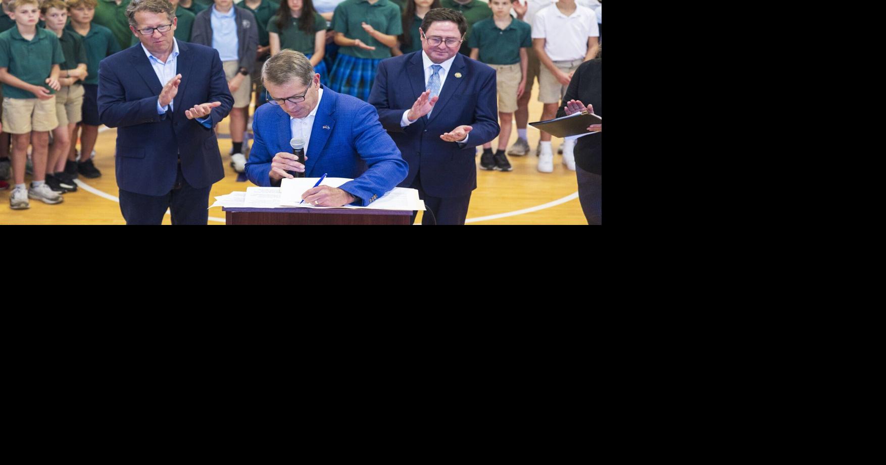 Gov. Jim Pillen, center, is flanked by Reps. Adrian Smith, left, and Mike Flood, right, as he signs a proclamation opting Nebraska into a new federal scholarship tax credit at St. Teresa Catholic School on Monday.