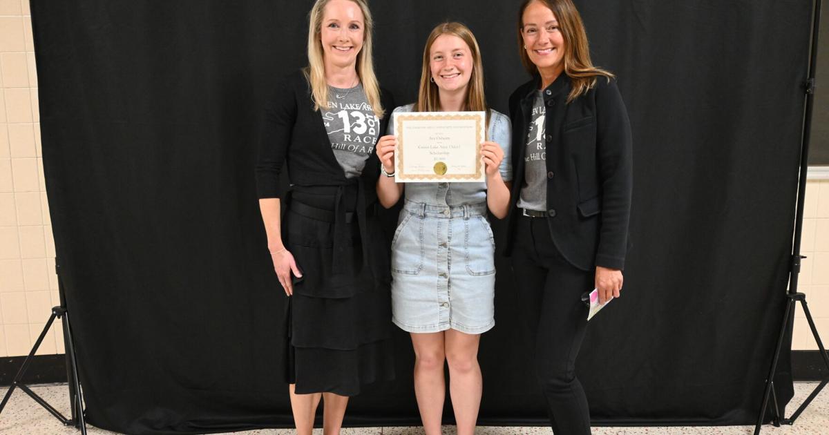 Ava Osheim receives the 2025 Green Lake Area 13dot1 scholarship from 13dot1 board members Kate Triller, left, and Mary Reabe during Ripon High School’s Senior Awards Night in late May.   Â