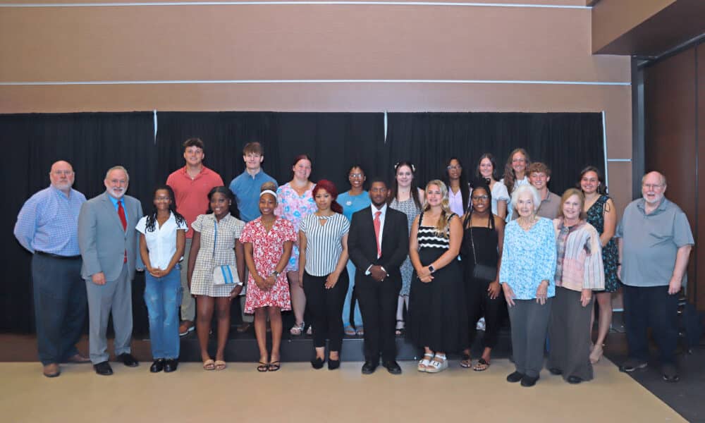 Among those being recognized were Morgan Neely of Byhalia, third from left, Jumiracle Williams of Jackson, Kiersten Levy of Madison, Jordan Taylor of Jackson, Zachariah Bell of Brandon, all of whom received the Dr. Nell Ann Pickett Endowed Scholarship; Lane Rowland of Madison, who received the Nancy and Toby Tenhet Endowed Scholarship; Jalia McDonald, who received the Marian Pickett Carmichael Endowed Scholarship; back from left, William Cochran of Flowood, Ashton Causey of Terry, Morgan Barlow of Brandon, Khamori Ratliff of Byram, Gertrude McCarthy of Brandon, Areiona Poindexter of Jackson, Amory Grzanich of Raymond, Mackenzie Smith of Hattiesburg, all of whom received the Dr. Nell Ann Pickett Endowed Scholarship; Conner Robinson of Pisgah, who received the F.N. & Eva Pickett Endowed Scholarship and Bethany Granberry of Terry, who received the Jimmy L. and Grace Pickett Long Endowed Scholarship. They are with Steve Pickett and Hinds President Dr. Stephen Vacik, front far left, and Grace Long, Leanne Long and Stacy Jay Long, front far right.