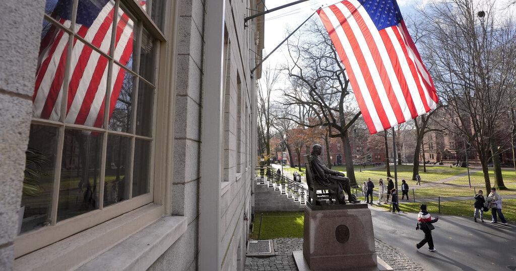 People walk past the John Harvard statue on the campus of Harvard University in Cambridge, Mass., Dec. 17, 2024.