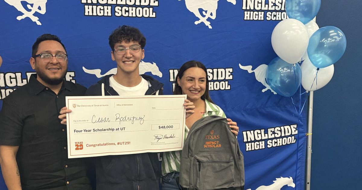 On March 24, representatives from the University of Texas at Austin and Ingleside ISD gathered to surprise graduating senior Cesar Rodriguez with the awarding of a $48,000 scholarship for UT-Austin that will go toward helping pay his tuition over the next four years.
