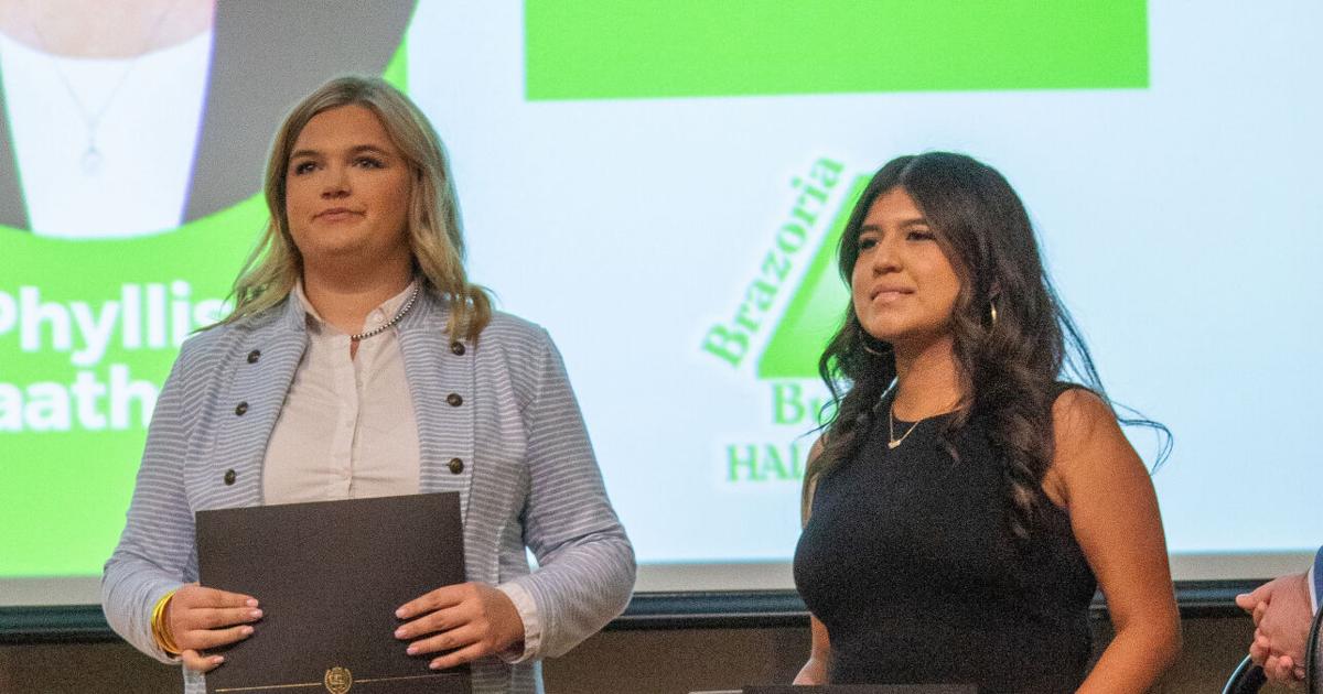 Scholarship winners Kenley Kincannon and Samantha Corona accept their scholarships during the JA Business Hall of Fame banquet Thursday evening at the Dow Center at Brazosport College in Lake Jackson.