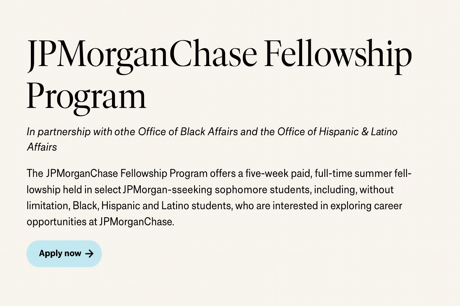 With curriculum-based learning, mentorship, and networking opportunities, the fellowship serves as a foundation for future internships and full-time roles at JPMorgan Chase.