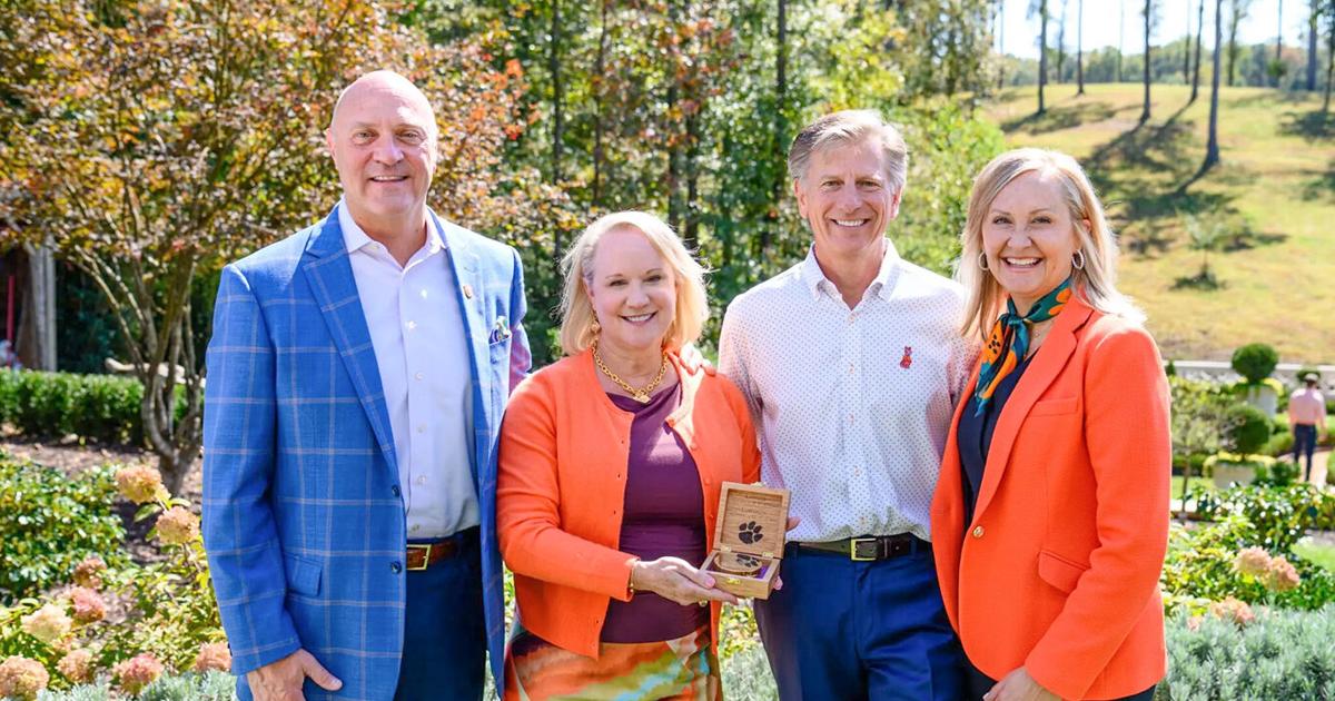 Pictured is Jim and Julee Kaplan (middle) standing next to Clemson University president Jim Clements (left) and his wife, Beth (right).