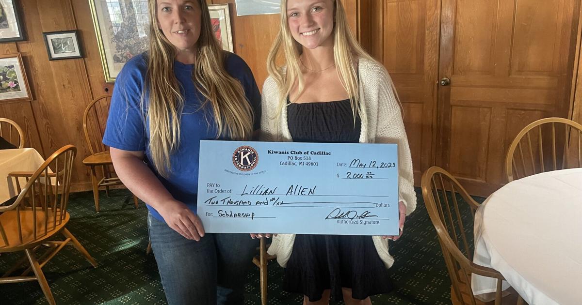 Kiwanis member Kourtney Kent presents a scholarship check to Lillian Allen, Cadillac High School.