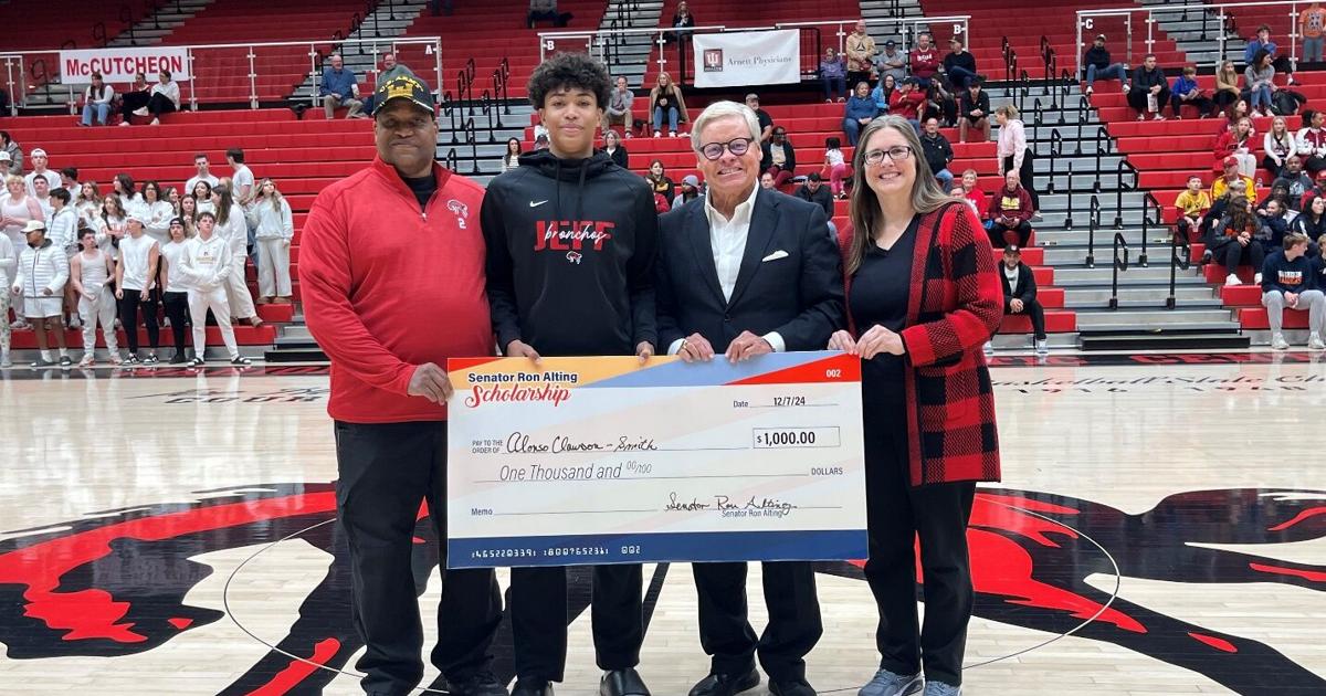 State Sen. Ron Alting (R-Lafayette, center right) presents a $1,000 scholarship to Alonso Clawson-Smith and his parents during the Hoops Classic Basketball Tournament.