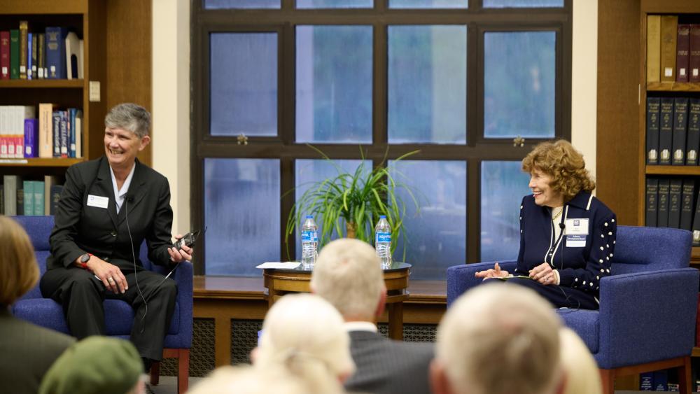 Dean Faye A. Chadwell and Sue Paterno share a laugh during their fireside chat celebrating Paterno Library’s 25th anniversary and Paterno’s service to Penn State University Libraries. Credit: Steve Tressler/Vista Pro Studios. All Rights Reserved.