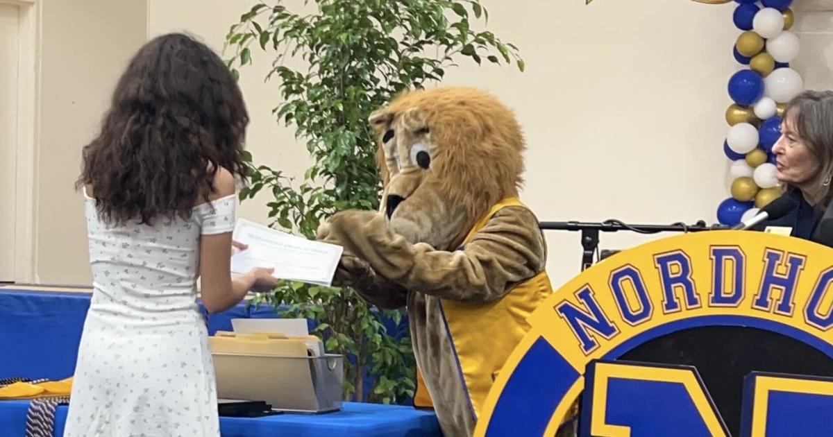 The Ojai Valley Lions Club Lion hands a $2,500 scholarship to Nordhoff senior Cynthia Fregoso on May 29. Pictured at right is Lions Club Membership Chair Marsha Kaye.