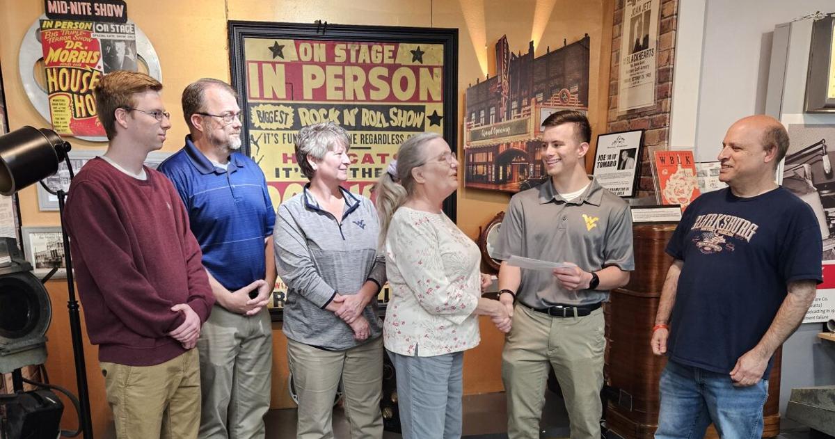 From left: Matthew Lunsford, second from right, received the $1,000 scholarship. He’s joined by brother Zack Lunsford, who’s attending West Liberty University; parents Dave and Teresa Lunsford parents; Genealogy Society Vice President Marilyn Blake; and Clarksburg History Museum President Mike Spatafore.