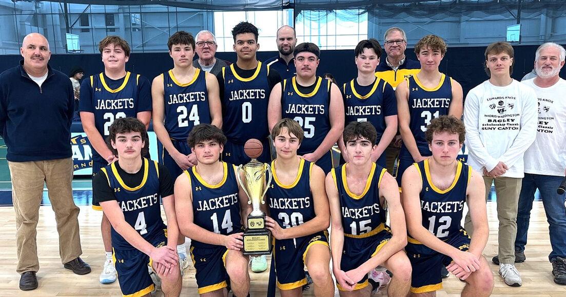 Madrid-Waddington downed Edwards-Knox in the Bagley Scholarship Classic on Saturday at SUNY Canton. Kneeling from left are: Brycen Hitsman, Ryan Mayette, Kolby Todd, Eli Cruz and Cole Smith. Standing are: Coach Aaron Jones, Corbin Durant, Jamison Zysik, Assistant Coach Denny Jones, Tyree Hawkins, Assistant Coach Quinn Shoen, Murphy Burke, Jakob Mayette, Assistant Coach Scott Shoen, Weston Kitzman, Scholarship Recipient Dylan Wood and TJ Bagley, the son of Rachael M. and Leon E. Bagley. Dave Shea/The Journal.