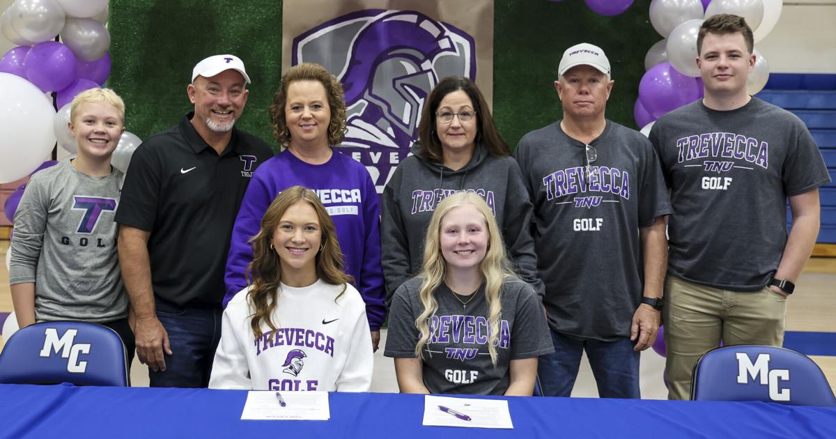 Macon County teammates Mattie Goad and Kamryn Vester sign to play golf for Trevecca Nazarene University to remain teammates. They are joined by Cole, Tyler and Amanda Vester and Sandy, Terry and Zachary Goad.