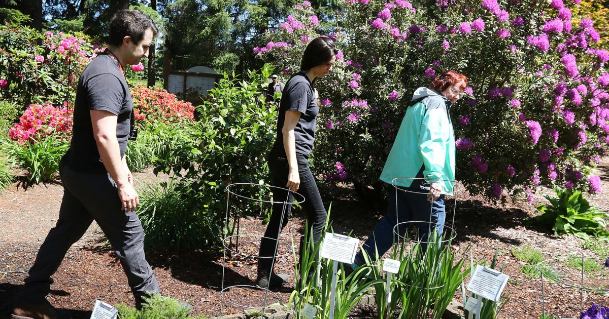 From right, Douglas County Master Gardeners Julie Stanbery, Syliva Andino and Christian Andino work in the Discovery Garden in Roseburg in May 2022.