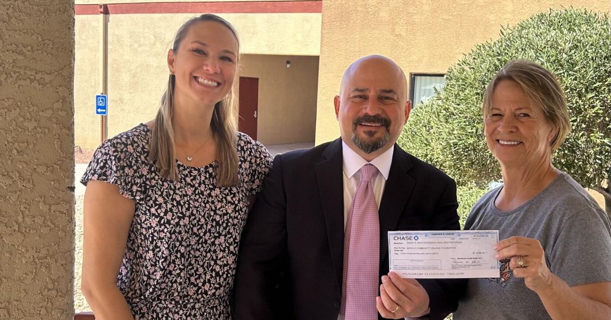 Dr. Jenna Lowder, Dean of Student and Community Engagement, and Julio Galindo, the executive director of the Mohave Community College Foundation, accepting a check from on the college’s Lake Havsu City campus from event coordinator Lynda Kristoffersen, to be used for the Adult Learner Restart Scholarship.