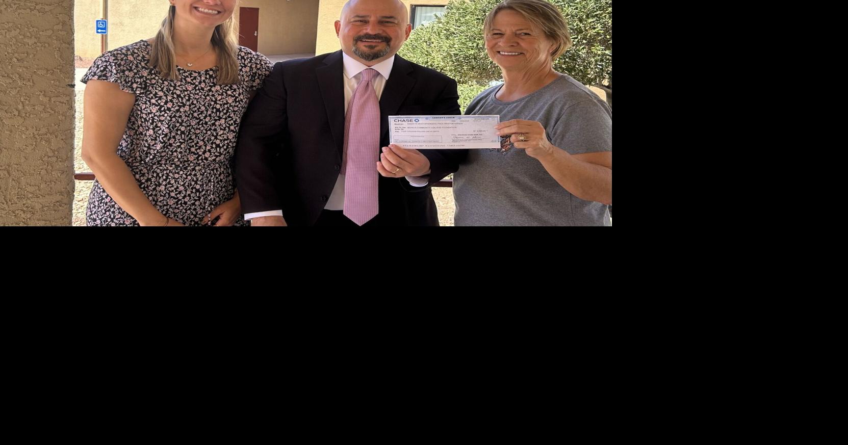 Dr. Jenna Lowder, Dean of Student and Community Engagement, and Julio Galindo, the executive director of the Mohave Community College Foundation, accepting a check from on the college’s Lake Havsu City campus from event coordinator Lynda Kristoffersen, to be used for the Adult Learner Restart Scholarship.