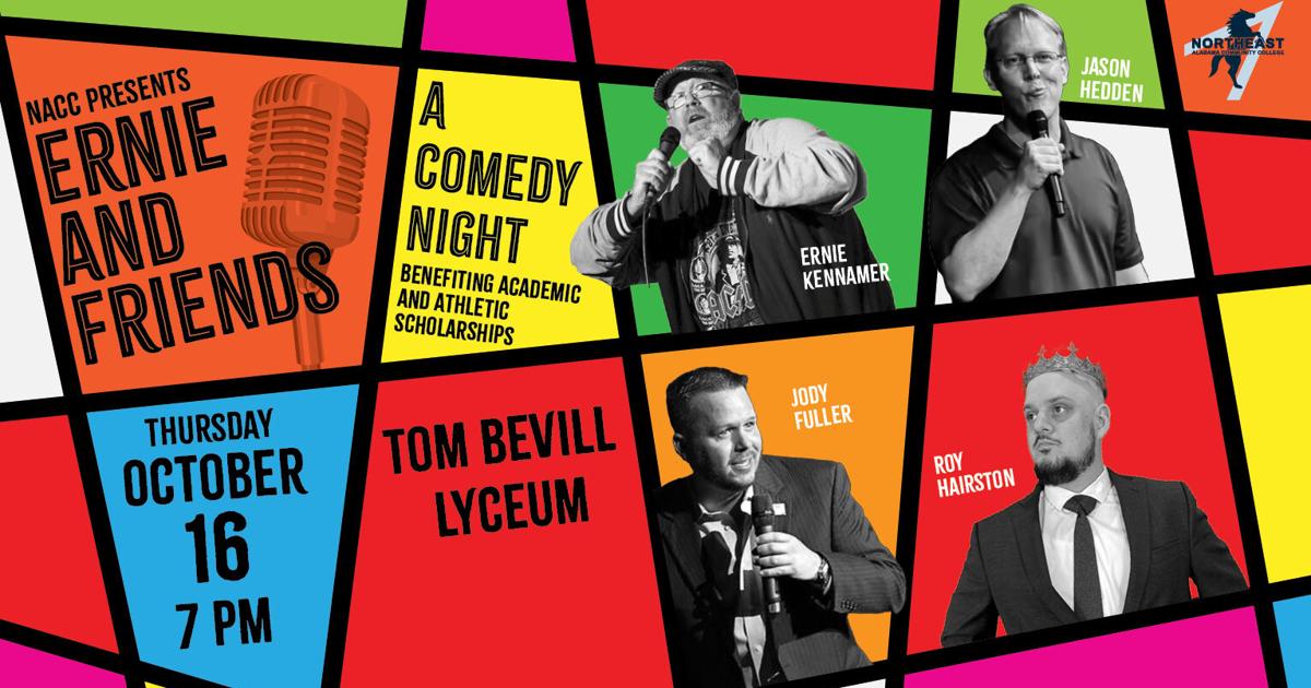 Northeast Alabama Community College will host the “Ernie & Friends” comedy show Thursday, Oct. 16, at 7 p.m. in the Tom Bevill Lyceum to raise funds for student scholarships.