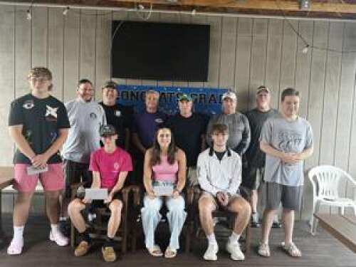 The Nesquehoning Sokol Club, presented 2025 high school scholarships. First row, seated, from left: Levi Kunkel, Brooke Mitzen and Brennan Kunkle. Back row, from left are: Spiridon Arthur, Robert Feinsilber, Brian Rehrig, Jimmy Kravelk, Jerry Snyder, Don DeMarco, Jerry Fisher and James Connel Jr. Not pictured are Kristen Skodacek and Benjamin Mitzen. CONTRIBUTED PHOTO