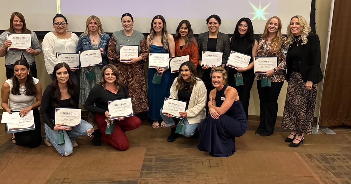 Nevada Women’s Fund scholarship recipients from Elko County line up at the Elko Conference Center on Oct. 9, 2025. GBC President Amber Donnelli is at top right and Ila Friedenthal from Nevada Women’s Fund is at bottom right. Some recipients were unavailable for the event.